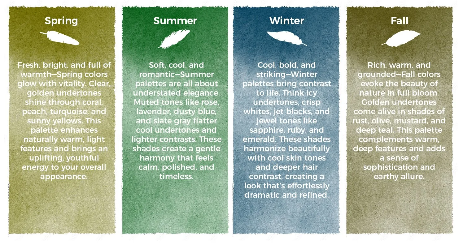 The 4x4 Color Analysis process works by evaluating four key characteristics of color—hue (warm or cool), value (light or deep), chroma (bright or muted), and contrast—to determine the palette that harmonizes best with an individual’s natural features. Through guided draping and comparison, different color families are placed near the face to observe how the skin responds: the right colors enhance clarity, even out tone, and make the eyes appear brighter, while the wrong ones can create shadows or dullness. By narrowing down these four dimensions, the process identifies a personalized color direction that brings balance, vibrancy, and cohesion to wardrobe, makeup, and overall styling.