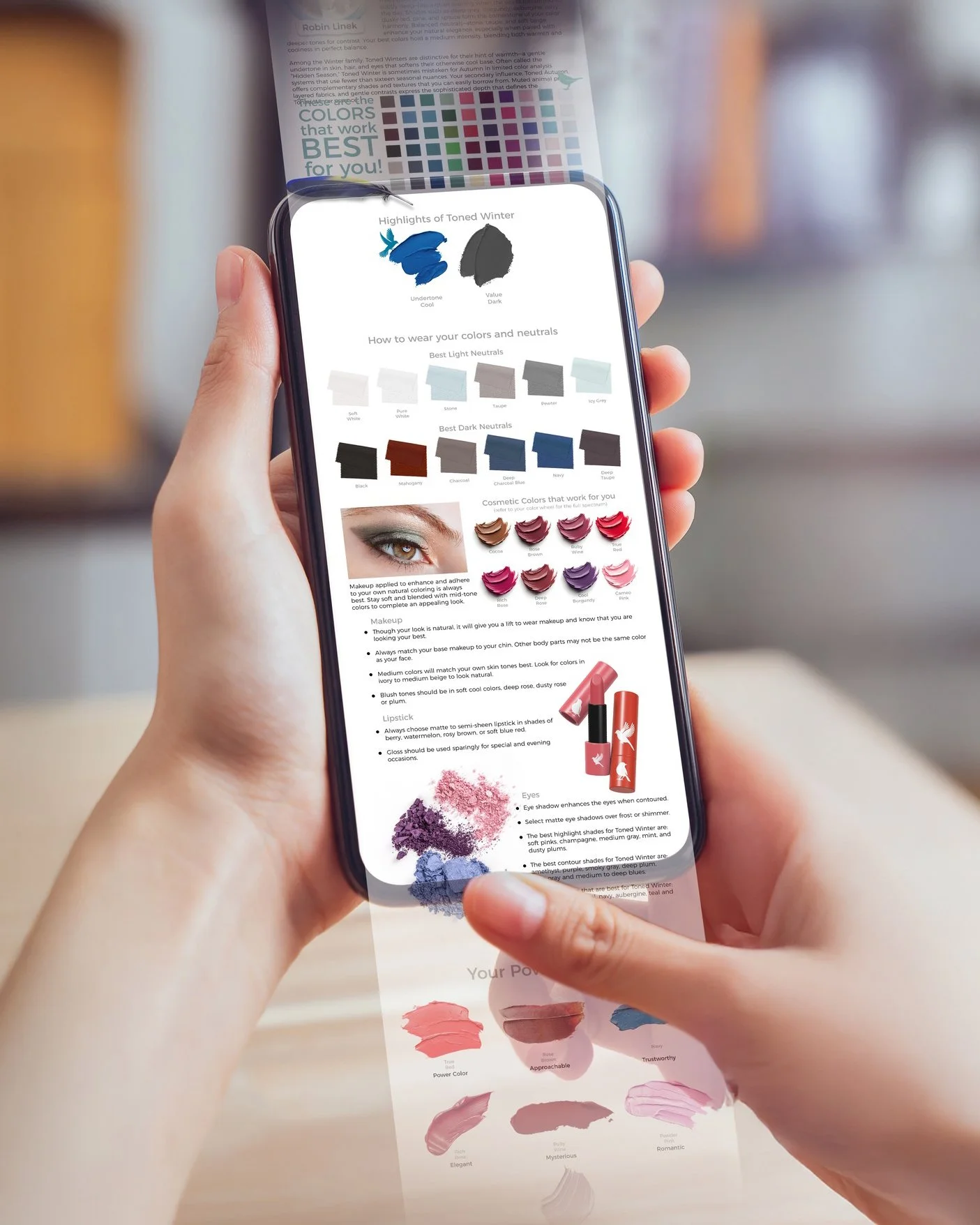 Dive into the world of color with our virtual analysis using our 16 Color System Analysis. Uncover shades that suit your style and spark joy in everyday life. We will send your personal color swatch booklet.